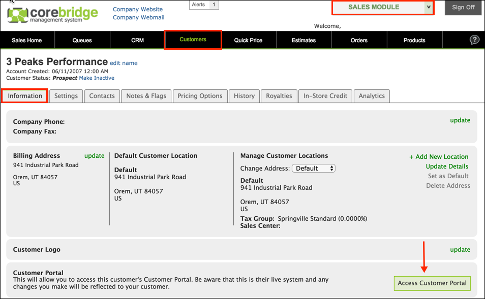 You can access your customer's portal at any time by clicking the Access Customer Portal link on the customer record as shown below.