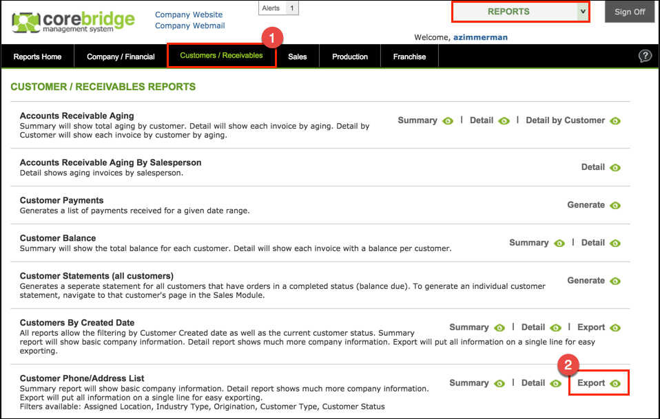 2. Click Export Under Customer Phone/Address List.