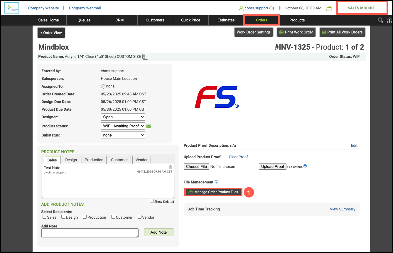 To access File Management on the Product level, navigate to Sales Module / Orders and select the appropriate Order and Product.