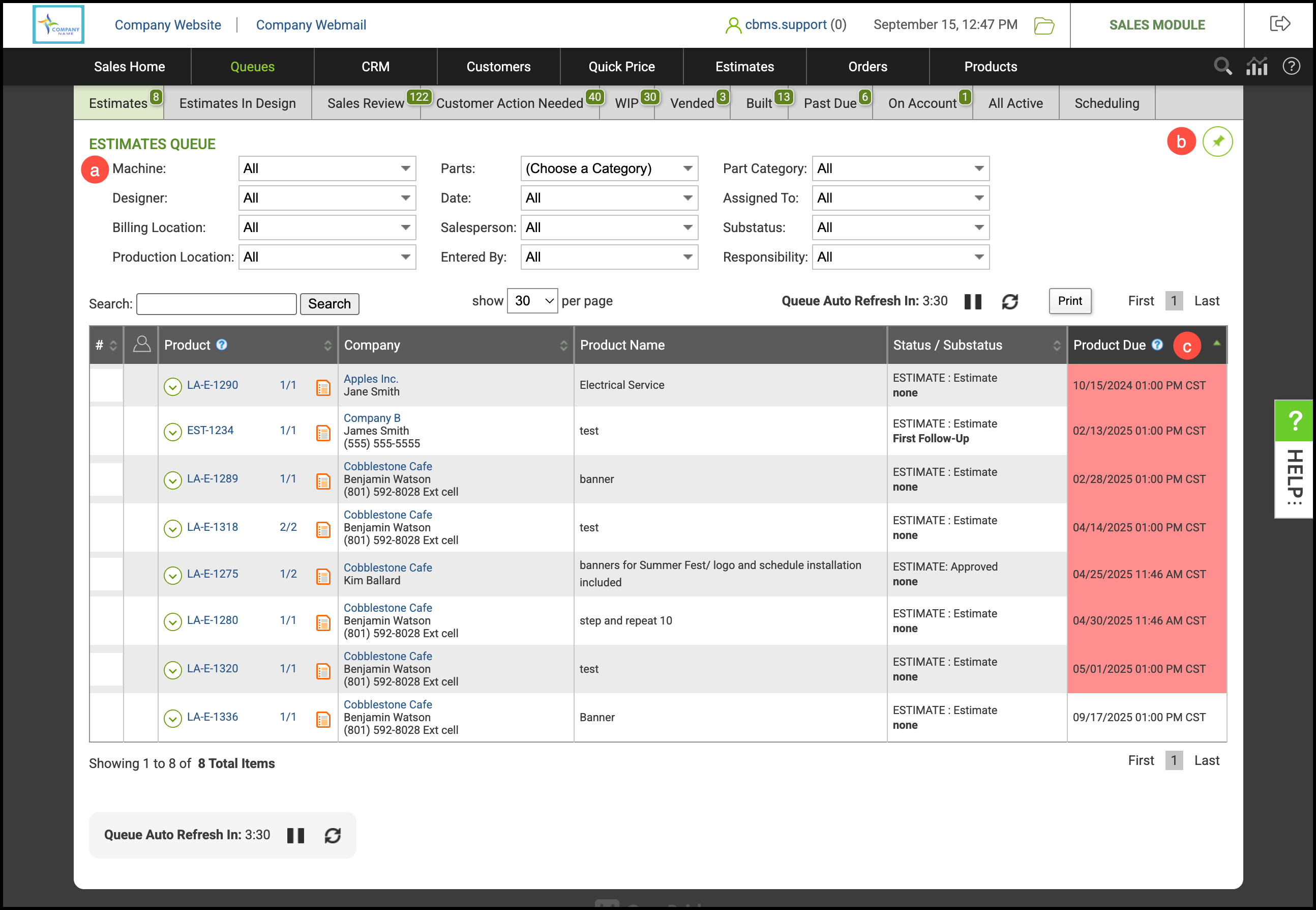 The Estimates Queue shows salespeople which Estimates require follow-up.