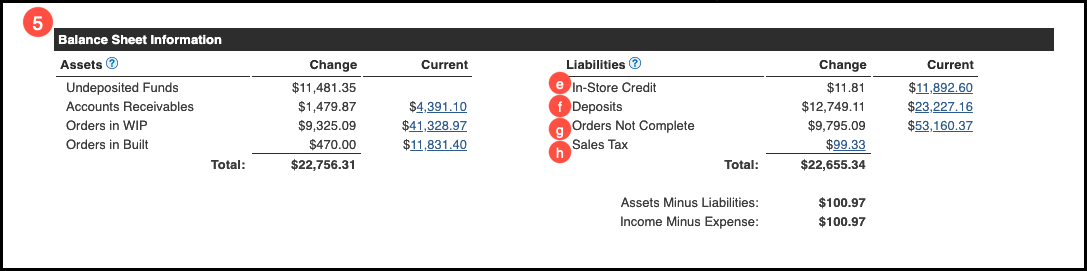 h. Sales Tax: This row only shows the change for this reconciliation period and not the current value. This change in your sales tax liability considers completed or voided completed orders during the reconciliation period.