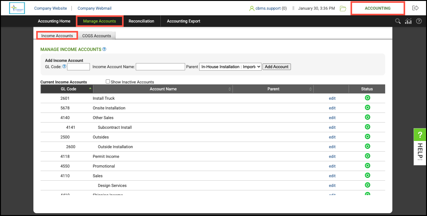 Navigate to Accounting Module / Manage Accounts / Income Accounts.