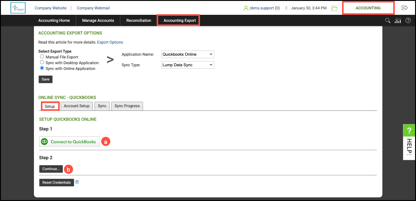 Navigate to Accounting Module / Accounting Export / Sync.