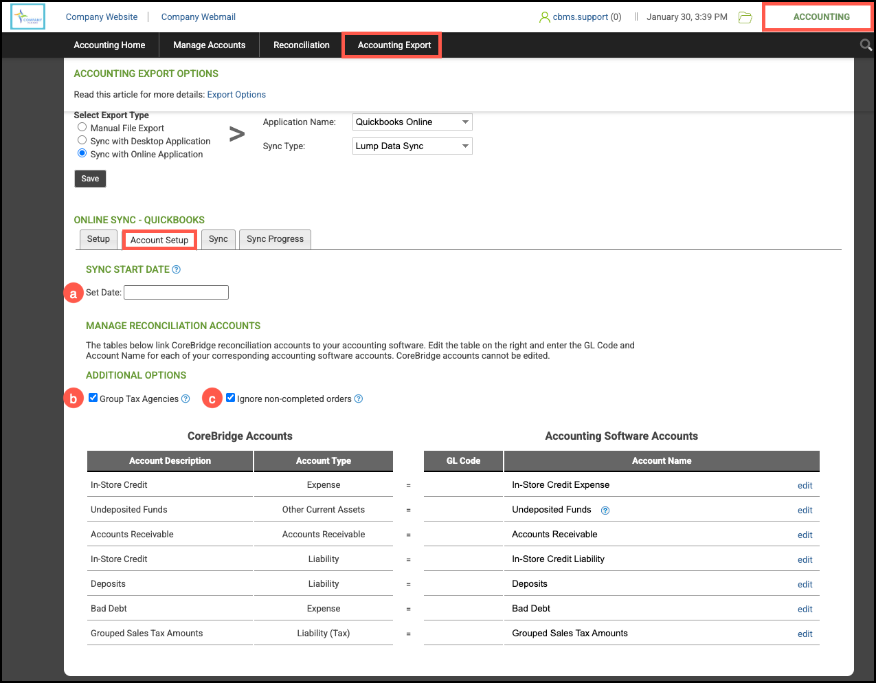 Note: If you have previously synced CoreBridge using a different accounting application or export method, stop and contact Support before proceeding to avoid data conflicts or duplicate entries.