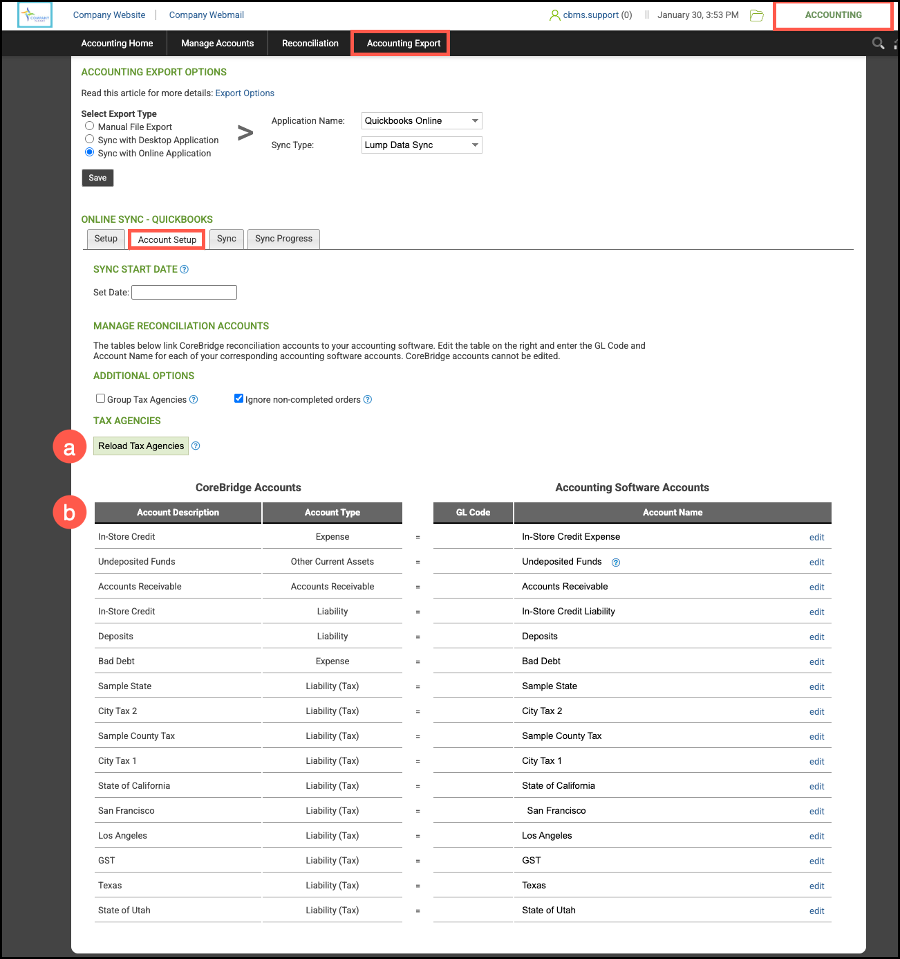 Ensure reconciliation accounts are aligned between CoreBridge and QuickBooks. The goal is to match the accounts in the Accounting Software Accounts section to QuickBooks.