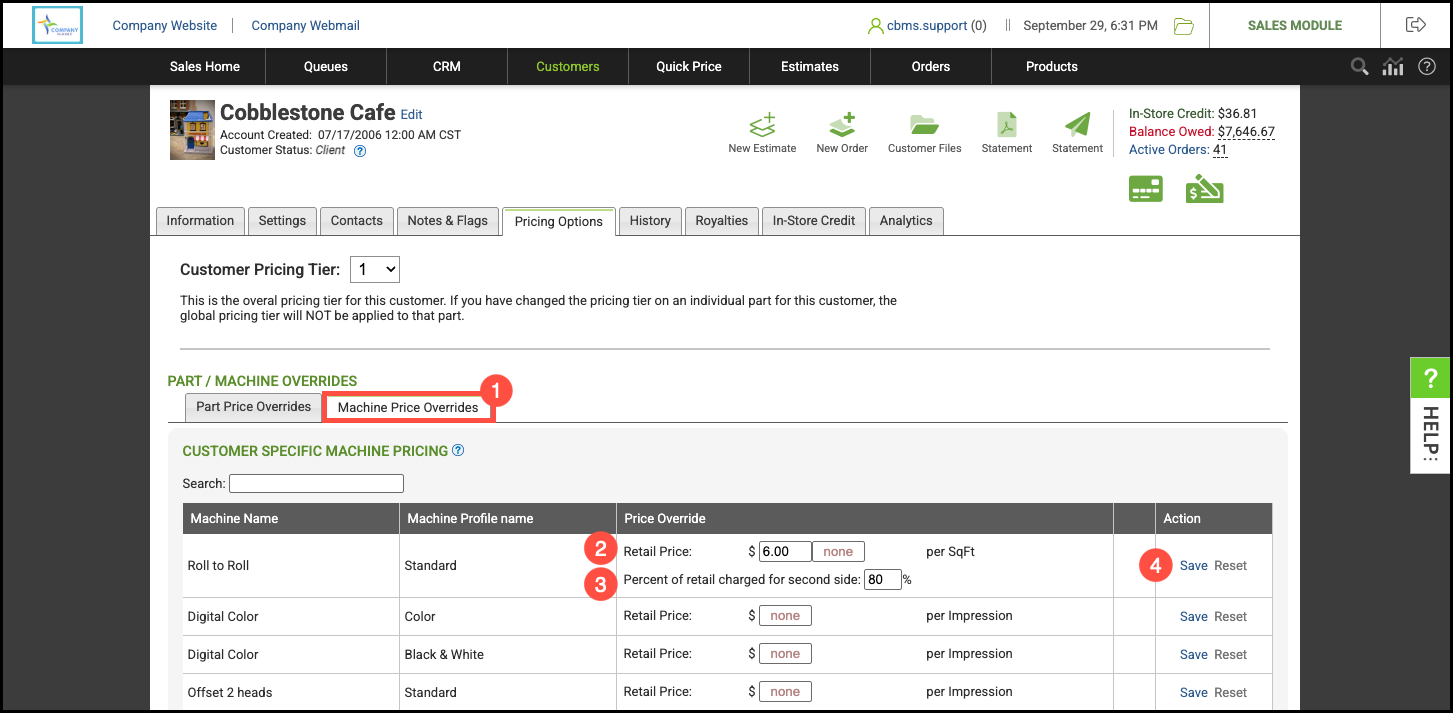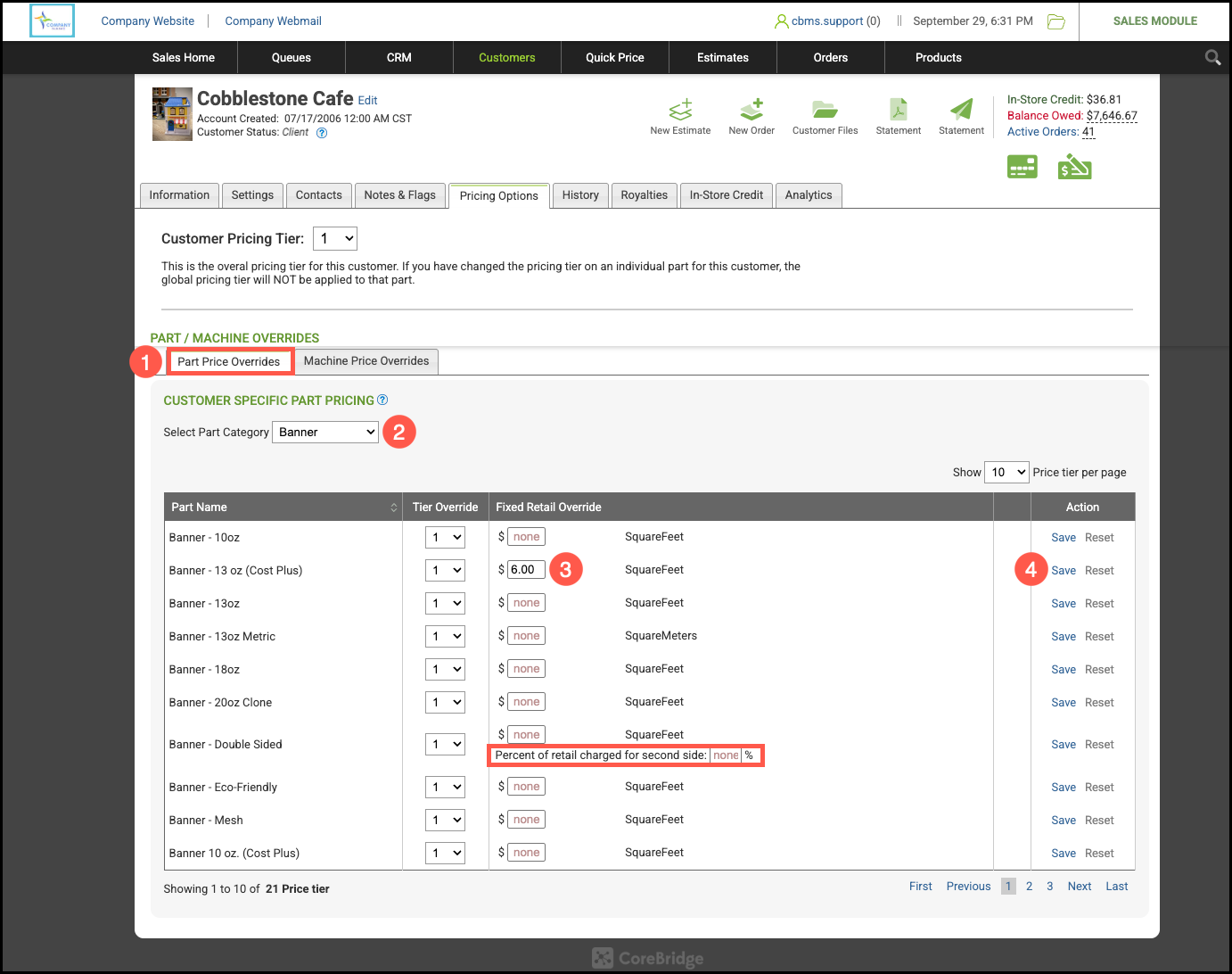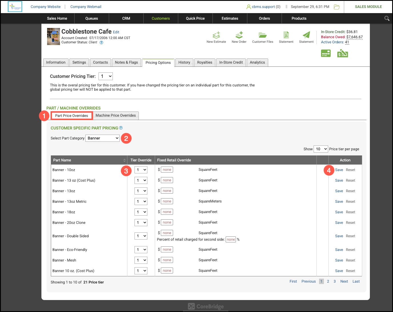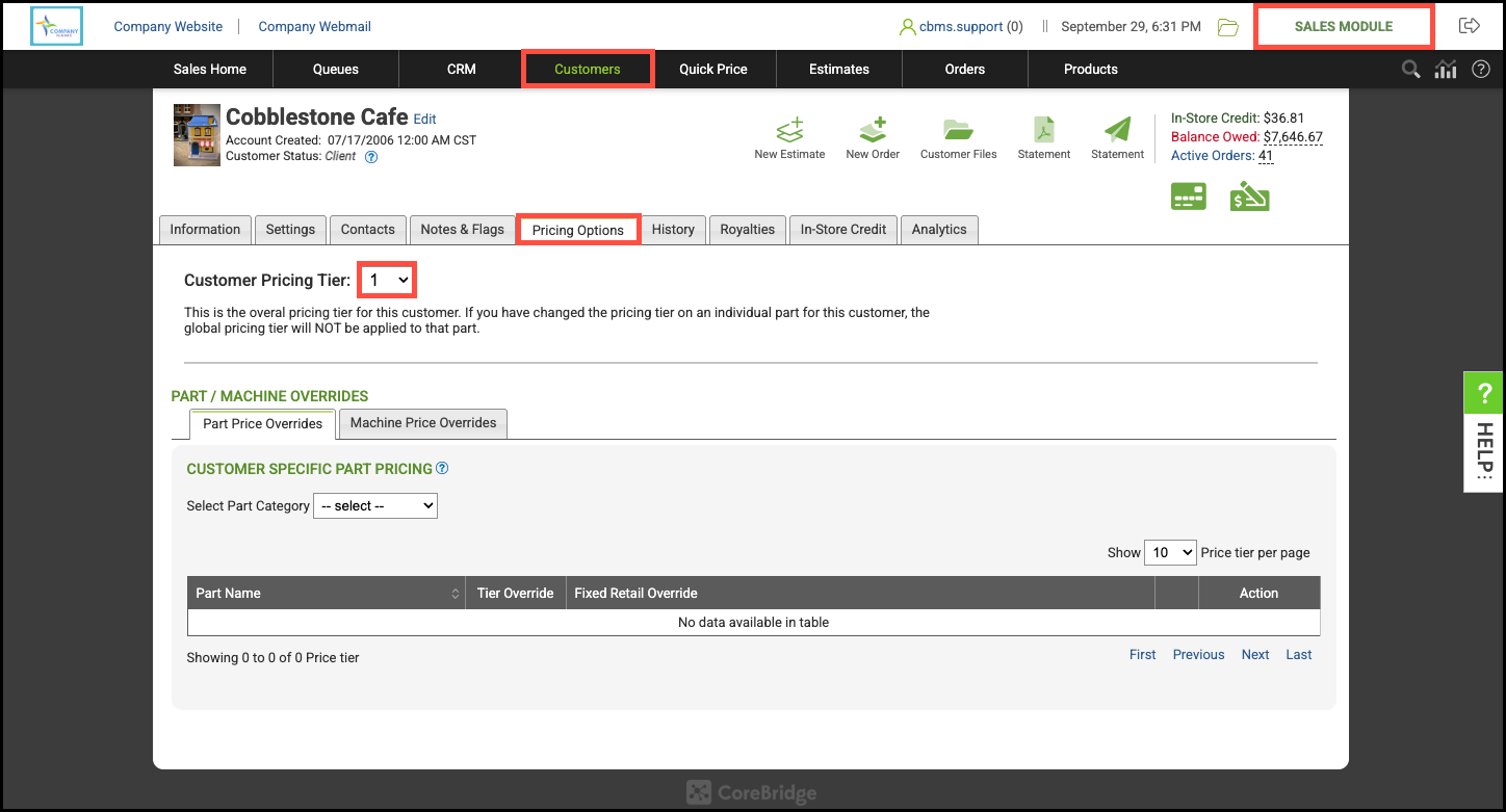 CoreBridge gives you flexible control over pricing at the Customer level. You can manage pricing in three ways: by assigning a Pricing Tier, setting Part Price Overrides, or setting Machine Price Overrides.