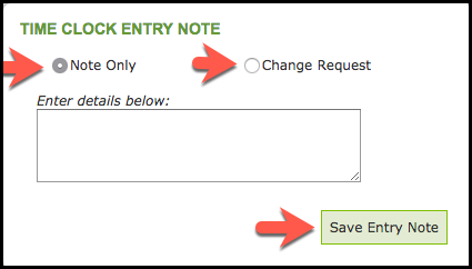 If there is an error on the timestamp, you can add an Entry Note with a Change Request which will allow a supervisor with access to the Users section of the Management Module to make any necessary adjustments to the Entires. For more information on how managers handle Change Requests, please see Manager Guide: Time Clock Adjustments & Activities.