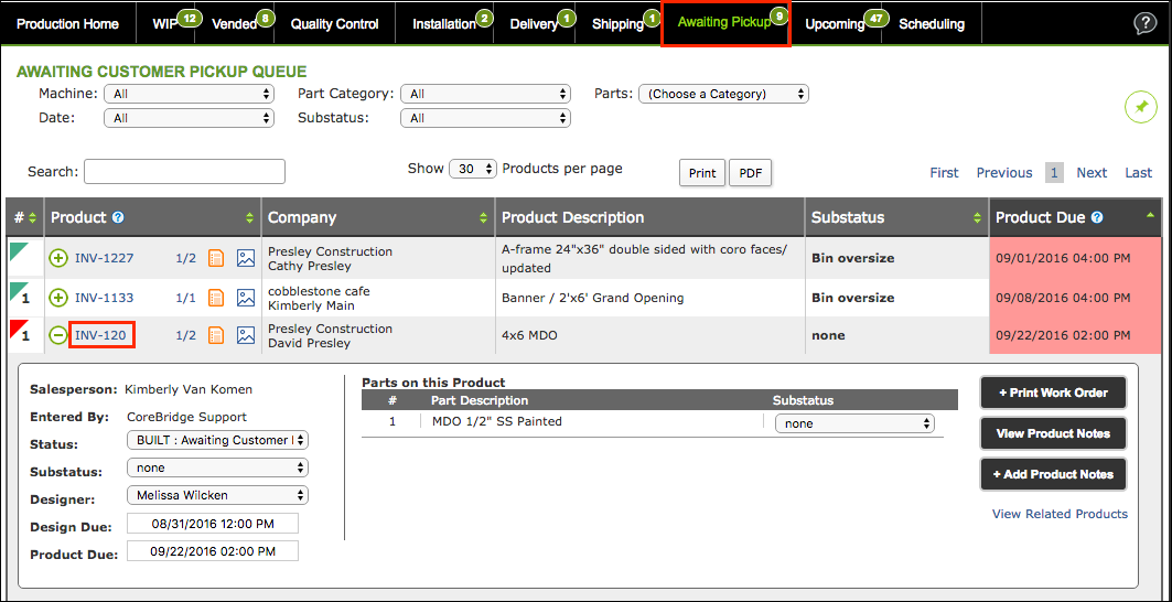 a. Production Queues: Each queue will list the products with the appropriate Product Status.