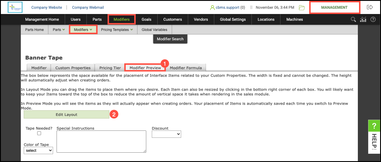 Use Layout Mode to control how Custom Properties appear during order entry so the fields are easy for users to see and complete.