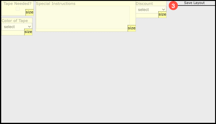Layout Mode lets you control exactly where your Custom Properties appear during Order entry. Click and drag each Interface Item to reposition it, and drag the corners to adjust its size. Make sure all properties stay within the gray box so they display correctly during Order entry.